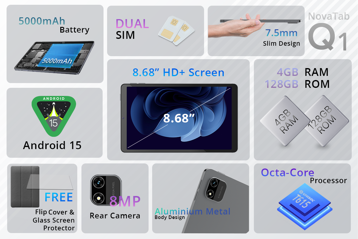 8.68″ HD+ Screen | Android 15 | 4GB RAM | 128GB ROM | 8MP Rear Camera
